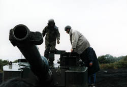 小雨という戦車日和(?)ということもあり、 砲塔に登るにも足元には気を付けないと危ないです。 戦車には2人づつ。車長と砲手のハッチに立ちます。 |