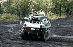 6輪のタイヤが付いた87式偵察警戒車 キャタピラの車を装軌式、タイヤを装輪式というが、タイヤはタイヤでも 弾を食らってもパンクしないランフラットなコンバットタイヤがついた 偵察用の車輌。このランフラットタイヤは、PAXのように小さなタイヤが 入っているタイプではなく、サイドウォールが分厚いタイプのもの。 いすずのトラックがベースだが、全輪駆動で前4輪が操舵する。 この時は、後4輪駆動、前4輪操舵というややこしい状態。 |