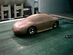 そのモデルを使って風洞実験を行った。 クレイモデルは1/10スケールで、心材にスタイロフォームや発泡スチロール を使い、表面にインダストリアルクレイを貼って成形。 |