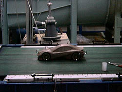 本田号の実験風景。 上部から3点ワイヤで吊り、前後にもワイヤをはって、前後ドラッグおよび前後車軸に 加わるダウンフォースもしくはリフトを計測する。 |