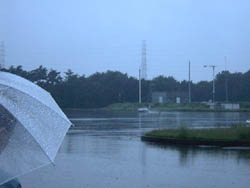 翌日は、ひどい雨。 ついでに寒い。 旋回試験をすると、すごい水しぶきです。 ルシオールの方は雨でも問題なく走れますが、人間の方はたまりませんね。 |