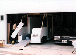 ガレージの中に、不審な物体! という訳ではなく、P-start実用車グループの 今期のアウトプットとして製作している 8輪救急車の1/1模型です。 |