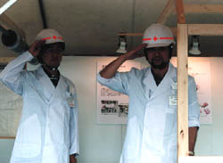 というハードなスケジュール。 普通の展示なら車をローダーに載せて、現地で降ろして パネルでも立てて...で終わりですが、 何せこのモデルは2×4の木工なので、家を建てるごとく 現地の建設工事が必要なのです。 |