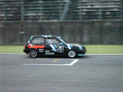 | スポーツ走行の時間ですから、いろいろな車と混走です。 後ろの白い車は、NSX。 さすがに高価な車なのか、それほど攻めていないのか、タイムは思ったほど速くは ありませんでした。 アルミボデーですし、ぶつけたら大変ですものね。 やはり、FJ1600なんかは速いですね。 |