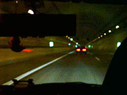 食べた後は、その前々日に開通したばかりの東京湾横断道路へ出撃です。 川崎側から渡ると、最初の10kmは延々まっすぐな海底トンネルです。 でも、新しいところだけにどんな仕掛けがあるか分かりませんから、飛ばせません。 |