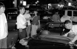 週末の大黒PAのにぎわいは大変なものです。 油圧で飛びはねている車あり、大音響のウーハーを積んだ車あり、最近は テレビもついていて、移動スクリーン車のようなものですね。 |
