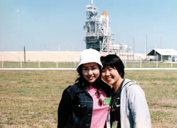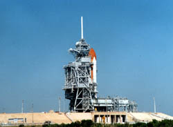 この時は、固体ロケットブースター(SRB)と外部燃料タンク(ET)は見えますが、 L-1までの間は、RSSと呼ばれる整備用の回転構造物がオービターの周りを 取り囲んでいるので全体像は見えません。 カメラをセットするなど、人が近づける間は燃料も注入されていません。 |