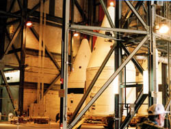 発射台は打ち上げ時に、「消音」のために大量の水が注入されます。 打ち上げ時の爆発的な騒音を水の気化エネルギーで吸収してやろう という仕掛けです。 そのための水タンクが左に見えます。 このタンクの容量は30万ガロン、つまり110万リットル以上の水が ためられていて、打ち上げ6.6秒前から直径2.1メーターというぶっとい 管を通って約20秒間注入が続きます。 音を抑えること自体発射台を守ることになるのでしょうけど、 消音のシステムと言っているところが面白いですね。 |
