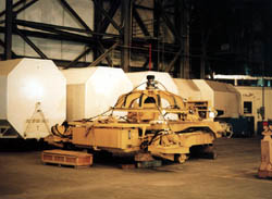VABで組み上げたロケットを打ち上げパッドへ運ぶ、 世界最大の「ハイブリッド電気」自動車。 サイズは40m×37.5m、高さは油圧ジャッキを内蔵していて 6.9mから7.9mまで上げられる。 ハイブリッドというのも、主エンジンは2基の2750馬力ディーゼル。 これで4基の発電機をまわして、キャタピラーそれぞれに4つずつ 合計16個のモーターで駆動する方式なのだ。 他にもジャッキや操舵用に1065馬力のエンジンを2基積んでいる。 ただ、最高速度は、ロケットを積んで1mile/hour。空荷だと倍の速度がでる。 何せ自重も270万kgもあるのだから、これも究極のVehicleに違いない。 |