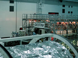 打ち上げのある当日はKSCには一般のビジターは入れなくなりますが、 それ以外は基本的に年中無休。 一人"DESTINY"の看板の前で働いている人が見えます。 これでサイズが分かると思います。 国際宇宙ステーションは当初の計画よりは縮小されてはいるもの、 完成すれば軌道上に浮かぶ巨大な施設となることには違いありません。 |