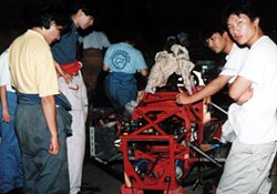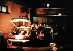 後席のバッテリーステーに足をつけます。 平らな部分を溶接するのは楽ですが、縦になっていたり、斜めだと、 鉄が溶けても重力で落ちなかったりして、難しいです。 それより、厚みの違う板同士なんかの方が難しいですがね。 |