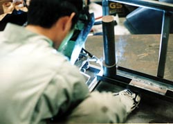 フレームを釣っている角パイをグラインダーで削ります。 グラインダーの火花、夏にはやっぱり花火が似合いますね(?) |