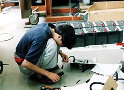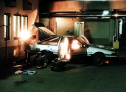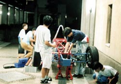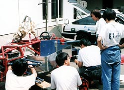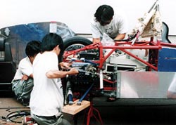 98eの調整中です。 湿気があると具合いが悪くなったり、インバータの信号ケーブルを 逆にしたら動いたり、調子はイマイチ。 実際、この98eは鈴鹿までそんな調子でした。 |