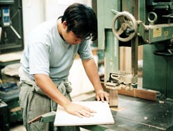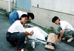 カウル組み立て中 なんで木工なんだぁ。 と叫んでも仕方ありません。FRPを成形している時間はなくなって しまったのです。カウル成形には時間をみておきましょう。 磨きは良かったんですけど、材料も手にいれのるが遅くなったし、 FRP部隊の参加が遅かった上に帰ってしまったので、木工による カウルが出番となったのでした。 |