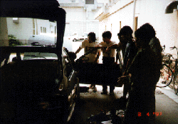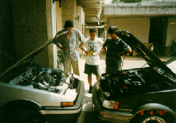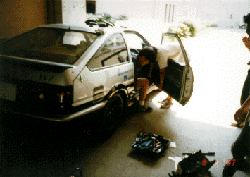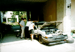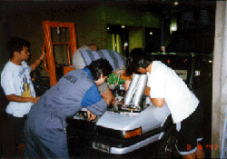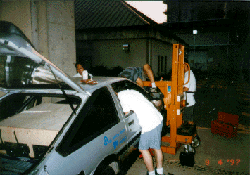フルスロットルでタイヤを空転させる時の音は、それは恐ろしい音。 「このまま鈴鹿には間に合わないのか?」という悪い予感が皆の頭をよぎる。 全く原因不明で手に負えないため、丁度会議で来る予定のあったモーターメーカー の人に来てみてもらうことになりました。 |
