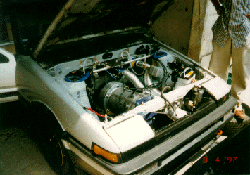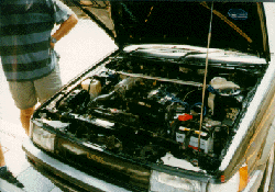 そして、こちらが電気のトレノ。 ブレーキブースタ用の負圧ポンプもついてます。 スロットルは、もともとエンジンで使っていたスロットルセンサーを 流用して、タワーバーに吊り下げてあります。 |