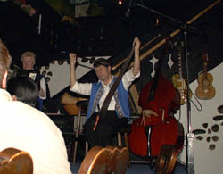 | スイスらしい民族音楽が演奏されていて、 もちろん「ヨロロエヒィー」なんてのも聞ける。 これは、ノコギリの楽器ですね。 後ろに見える階段に立てかけてあるホルンは、階段の上から吹くながーい ラッパですが、これに挑戦のコーナーでは「若き血」も出て 大盛り上がり。 | |