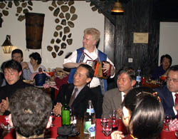スイスの飯といえば....「チーズ・フォンデュ!!」と 誰でも答えるので、フォンデュを頼んだら、チーズでなく 油で肉を揚げる料理になりました。 みなさん、チーズフォンデュは、チーズフォンデュといわないと、 牛肉を油で揚げる料理になります。 でも、これが結構イケル。 なまじチーズだと、コッテリしすぎて食べられなかったかも。 ジュネーブじゃ、こんな高級な場所では食べられなかったから、 松本先生ありがとう! |